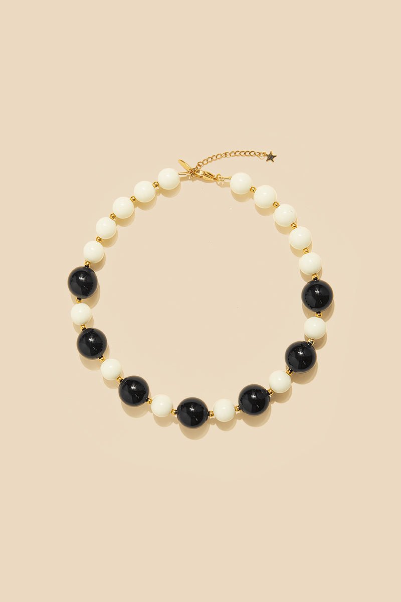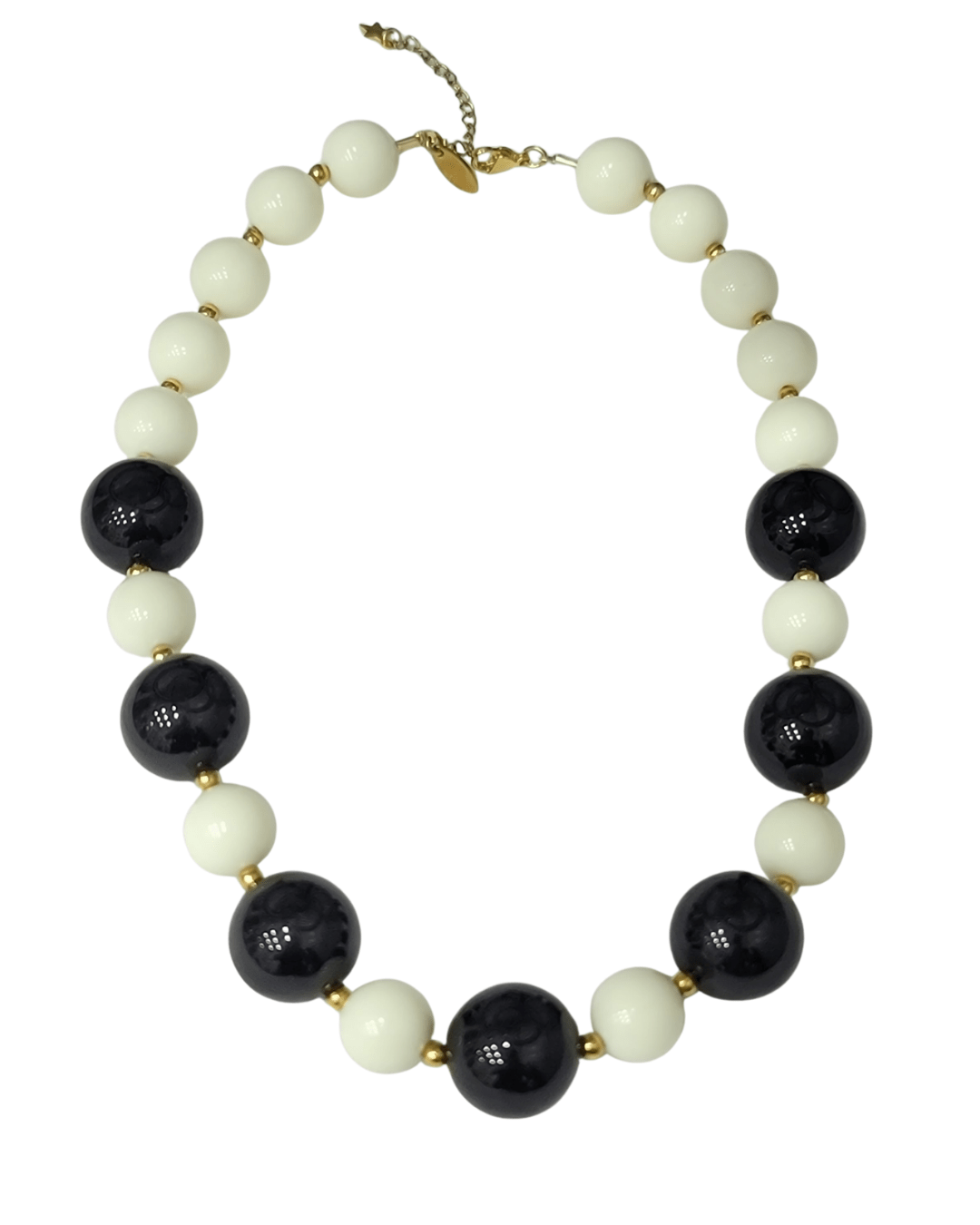 Collar con bolas de resina en color negro y mantequilla. Lleva bolitas de acero inóxidable