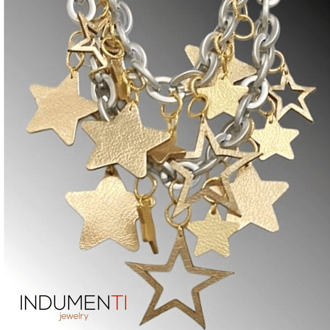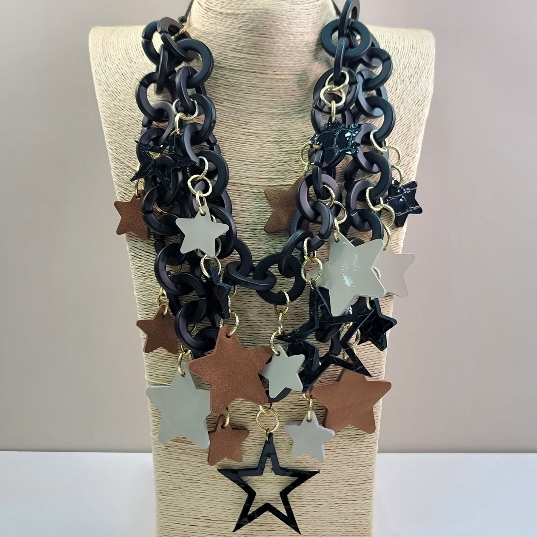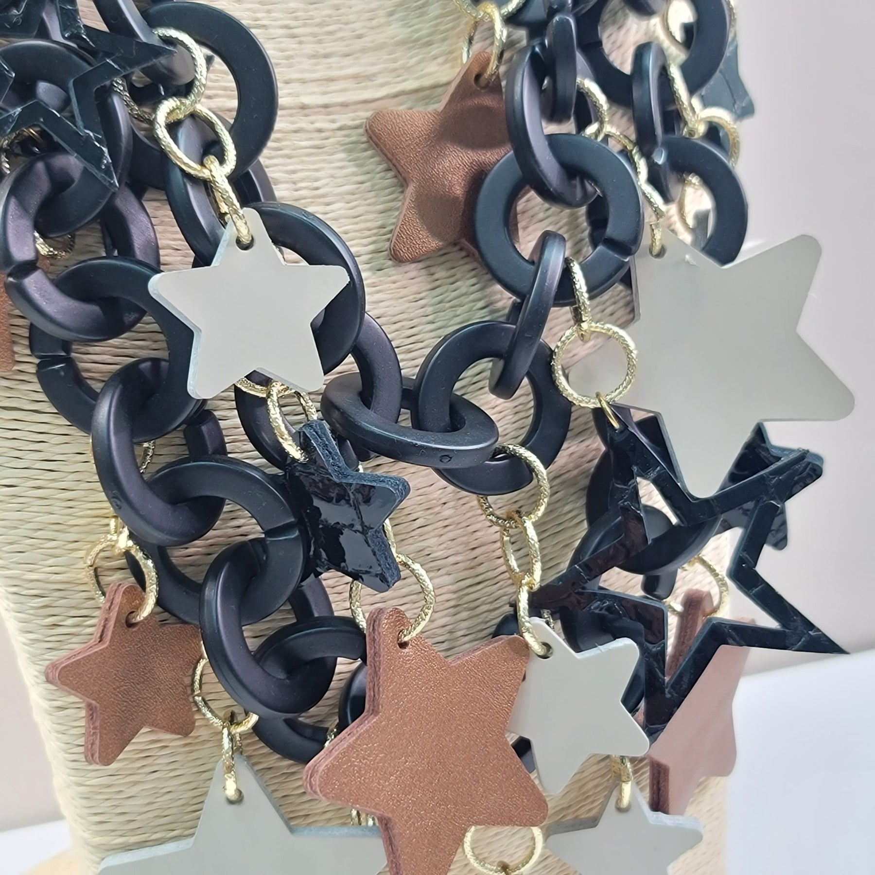 Collar artesanal Indumenti, elaborado a mano en cuero y acrílico con detalles de estrellas metálicas.Un diseño que captura la energía del universo con elegancia y carácter.