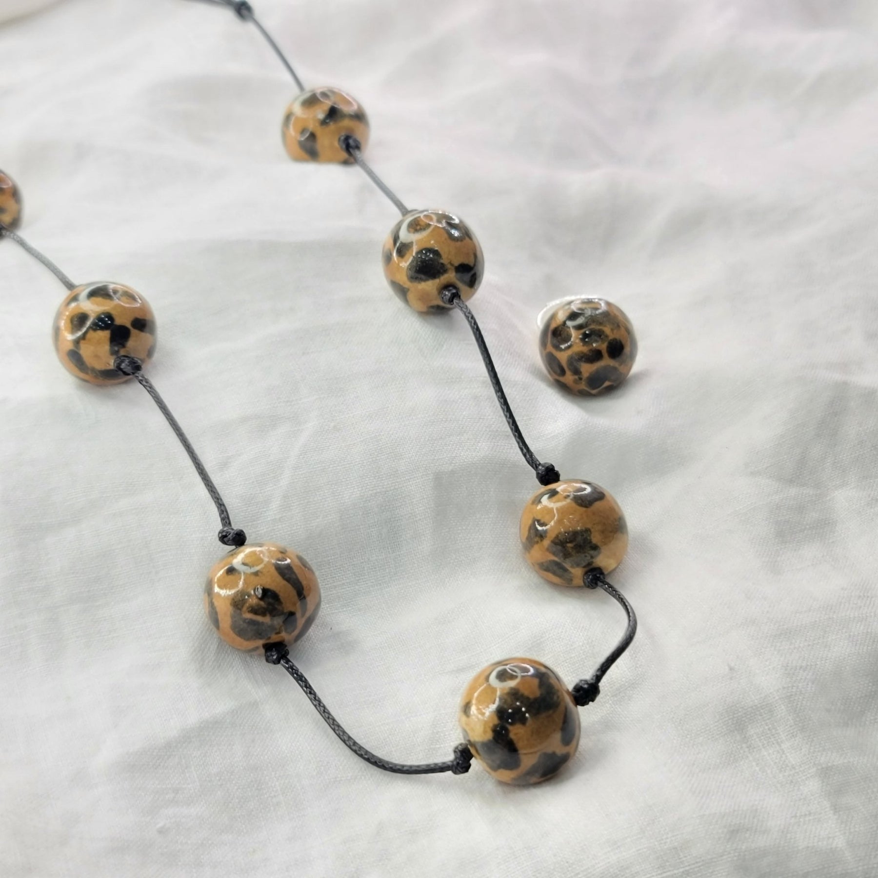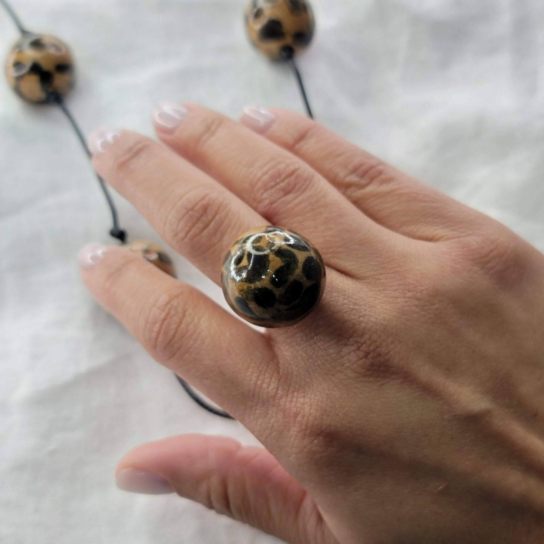 Collar y sortija artesanal en barro esmaltado con estampado animal print. Hecho a mano en Puerto Rico, un diseño que combina fuerza y elegancia natural.