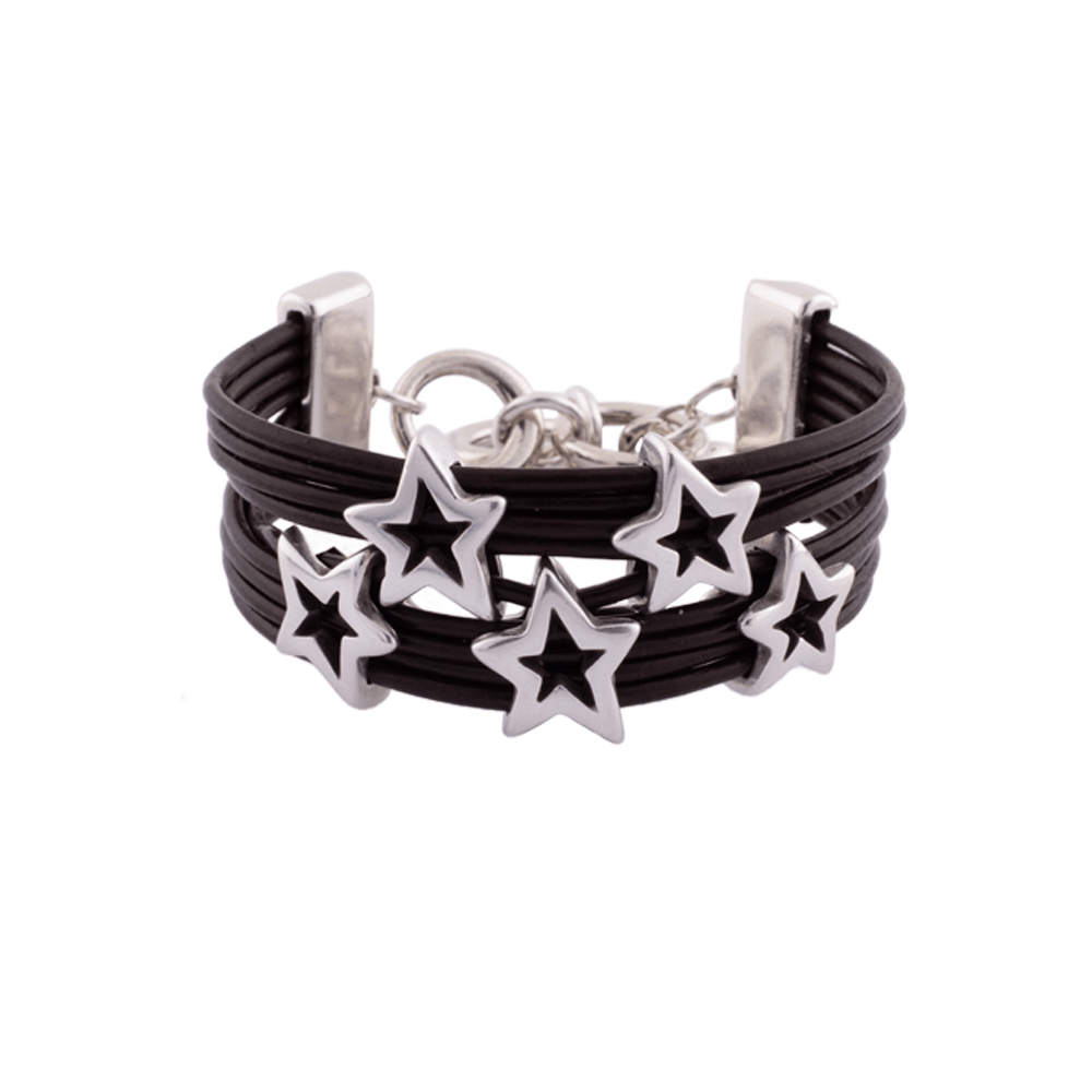 Pulsera Supernova. Fabricada en cuero, con cinco estrellas en el centro. Ajustable a cualquier tipo de muñeca.