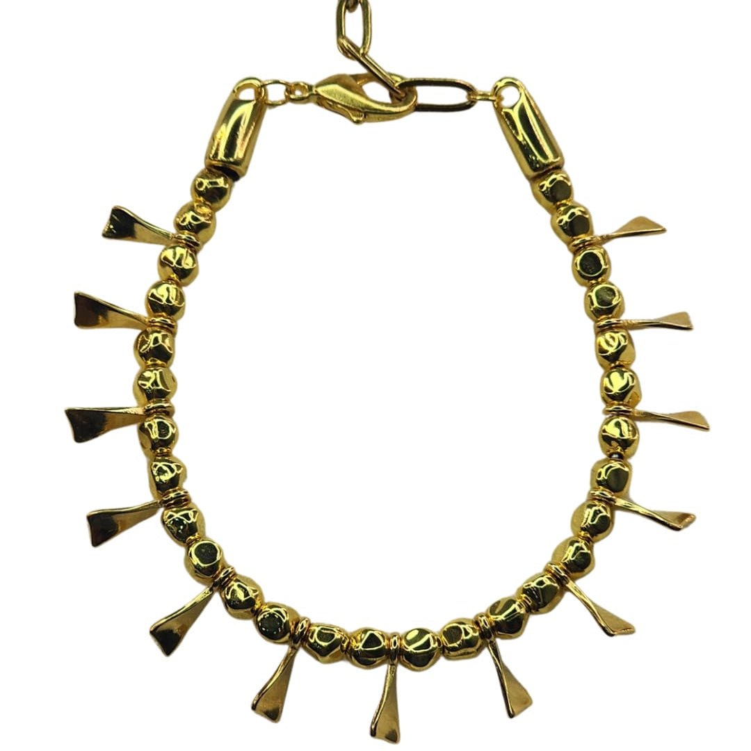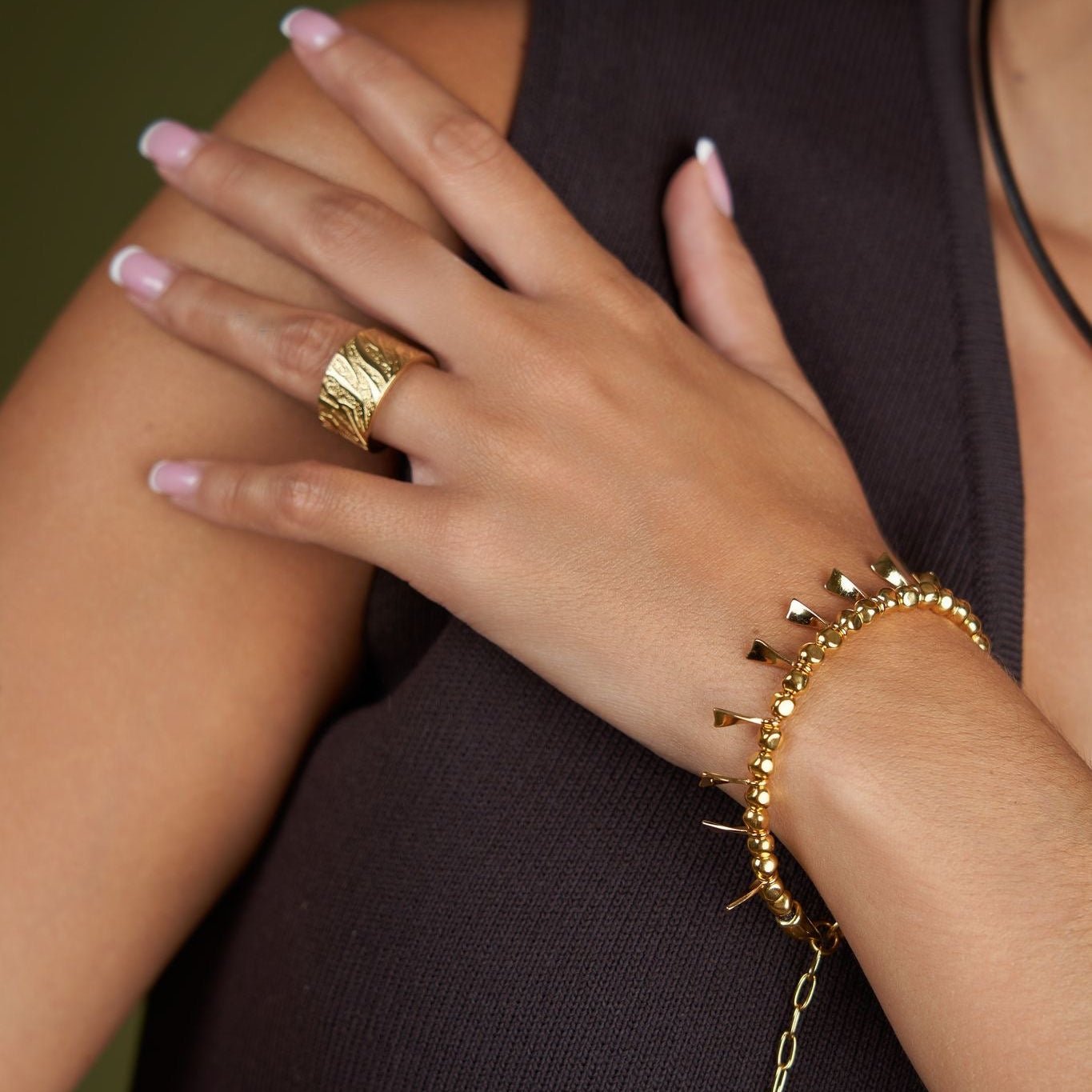La Pulsera Talismán de Pikadura es una joya llena de movimiento y energía.Diseñada con una base de bolas metálicas y pequeños pétalos en plata envejecida, evoca los antiguos amuletos protectores reinterpretados con un estilo moderno.