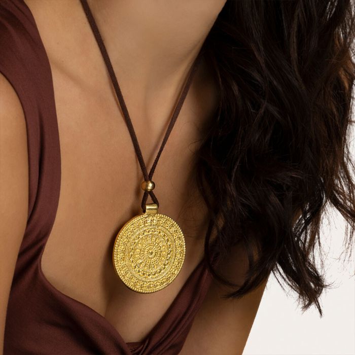 Collar de hilo colgante en latón reciclado con placa de diseño. Ajustable. Longitud del collar: 45 cm. Cierre ajustable con mosquetón. Nickel testado. Artesanía hecha a mano. Joyas únicas y artesanales, ideales para complementar cualquier look o como un regalo especial.