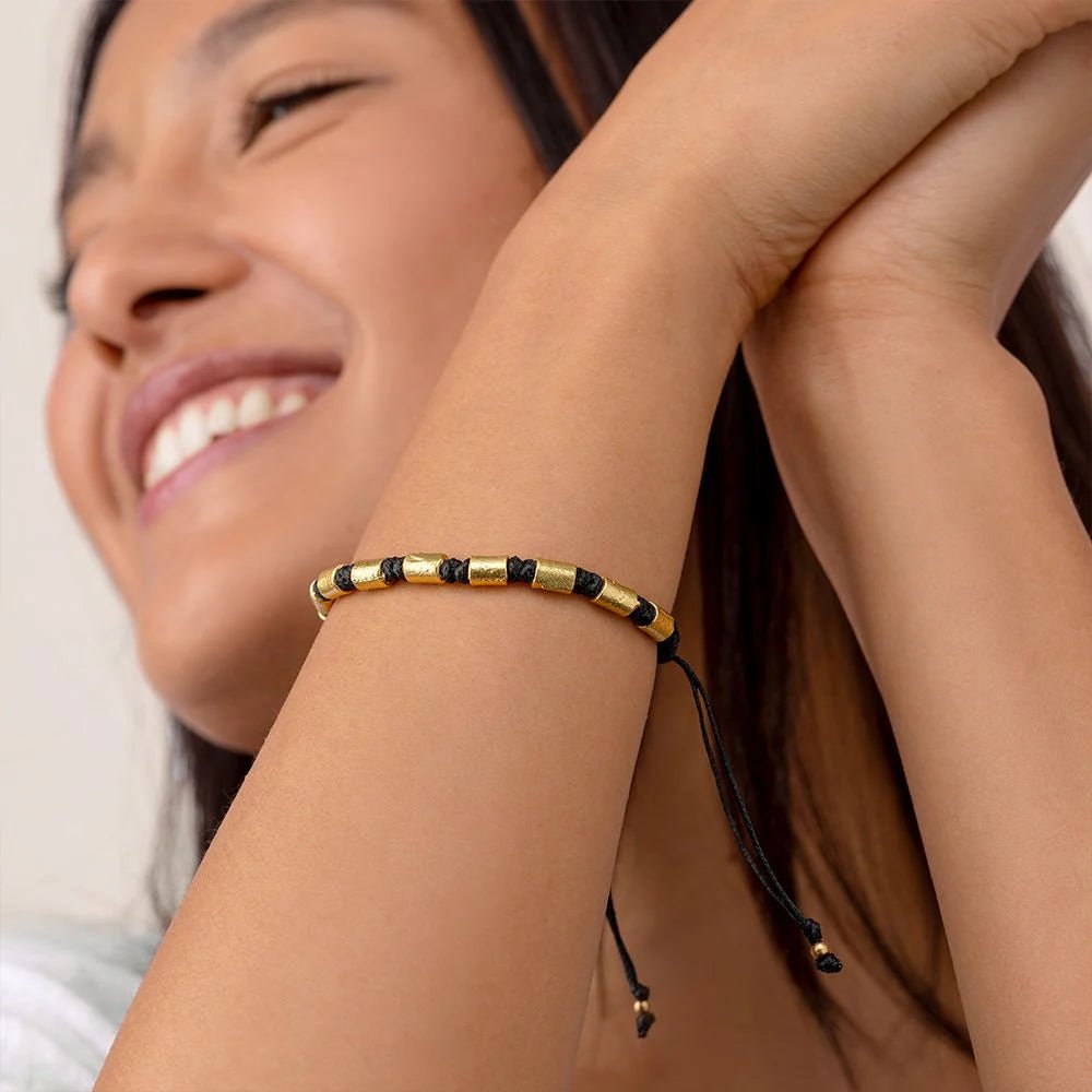 Adjustable wire bracelet cylinders. Made with macrame work. 100% brass recycled. Nickel tested. Handcrafted.