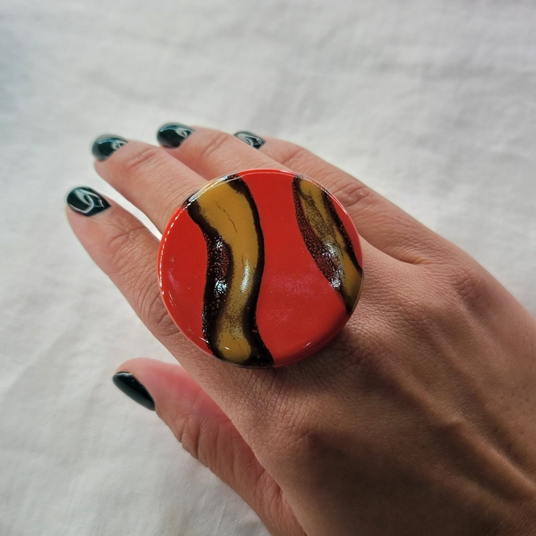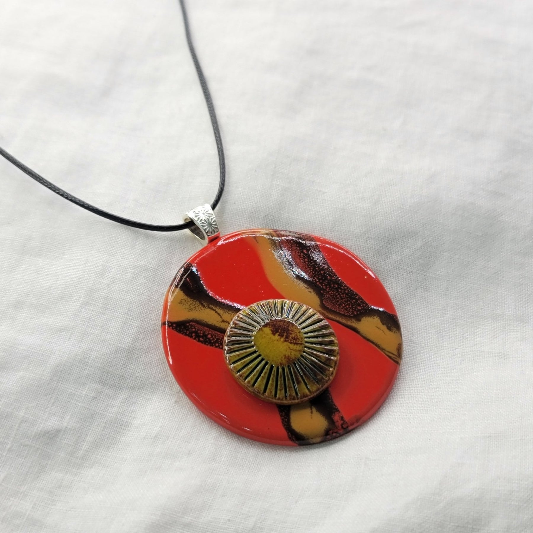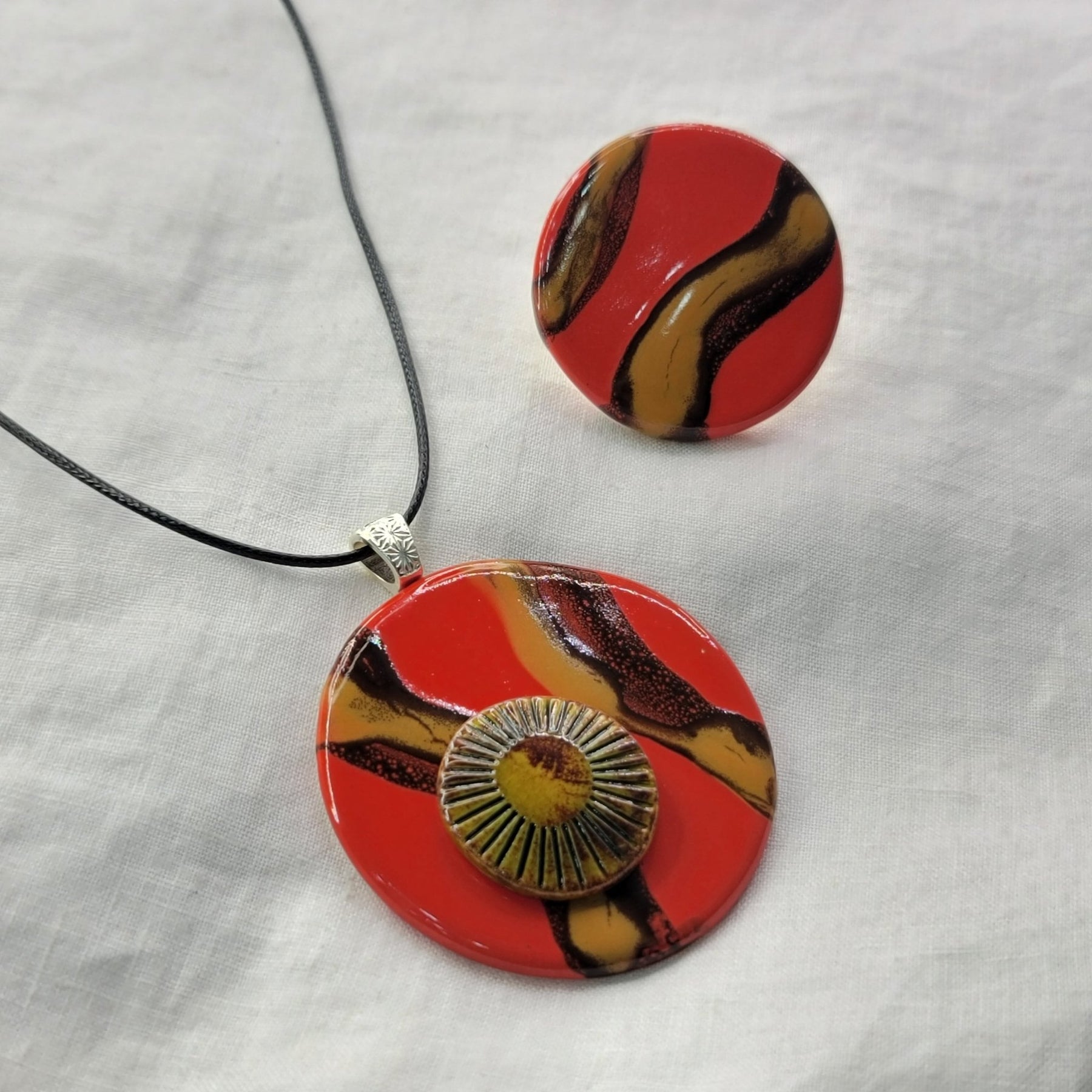 Pieza artesanal hecha a mano en Puerto Rico. Incluye collar y sortija en barro esmaltado, inspiradas en los tonos cálidos del amanecer caribeño.