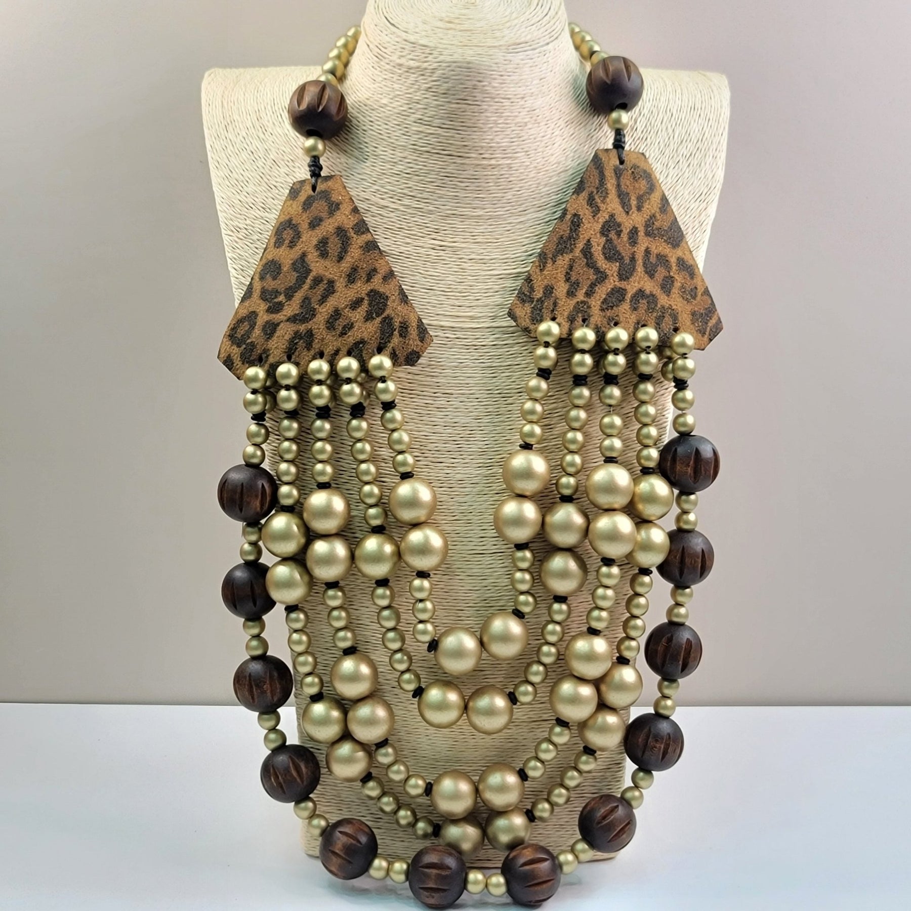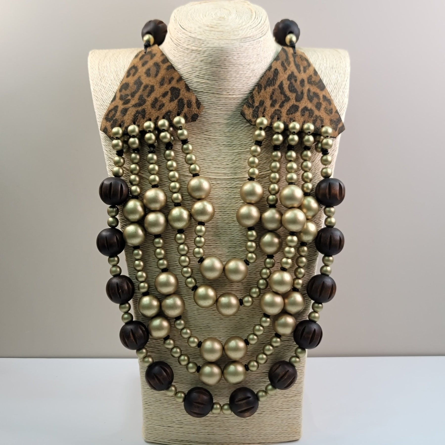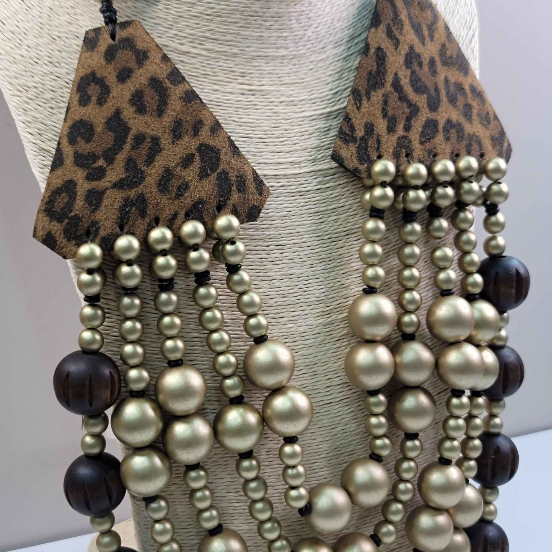 Collar artesanal Indumenti, elaborado a mano en cuero, acrílico y madera con detalles en animal print.Una pieza audaz, elegante y llena de carácter.