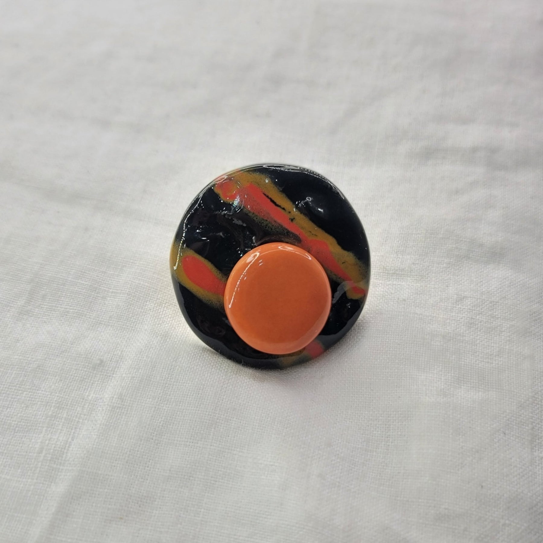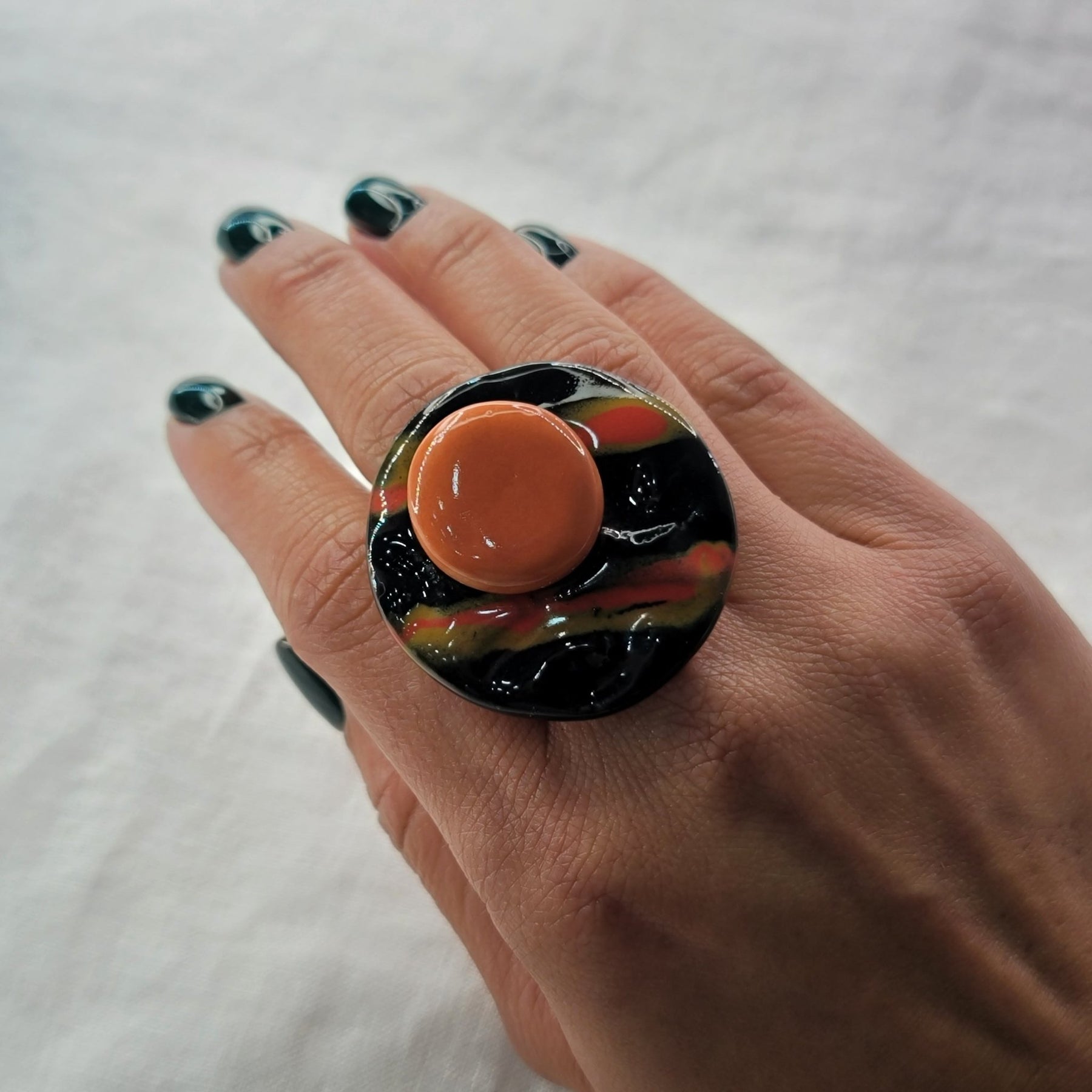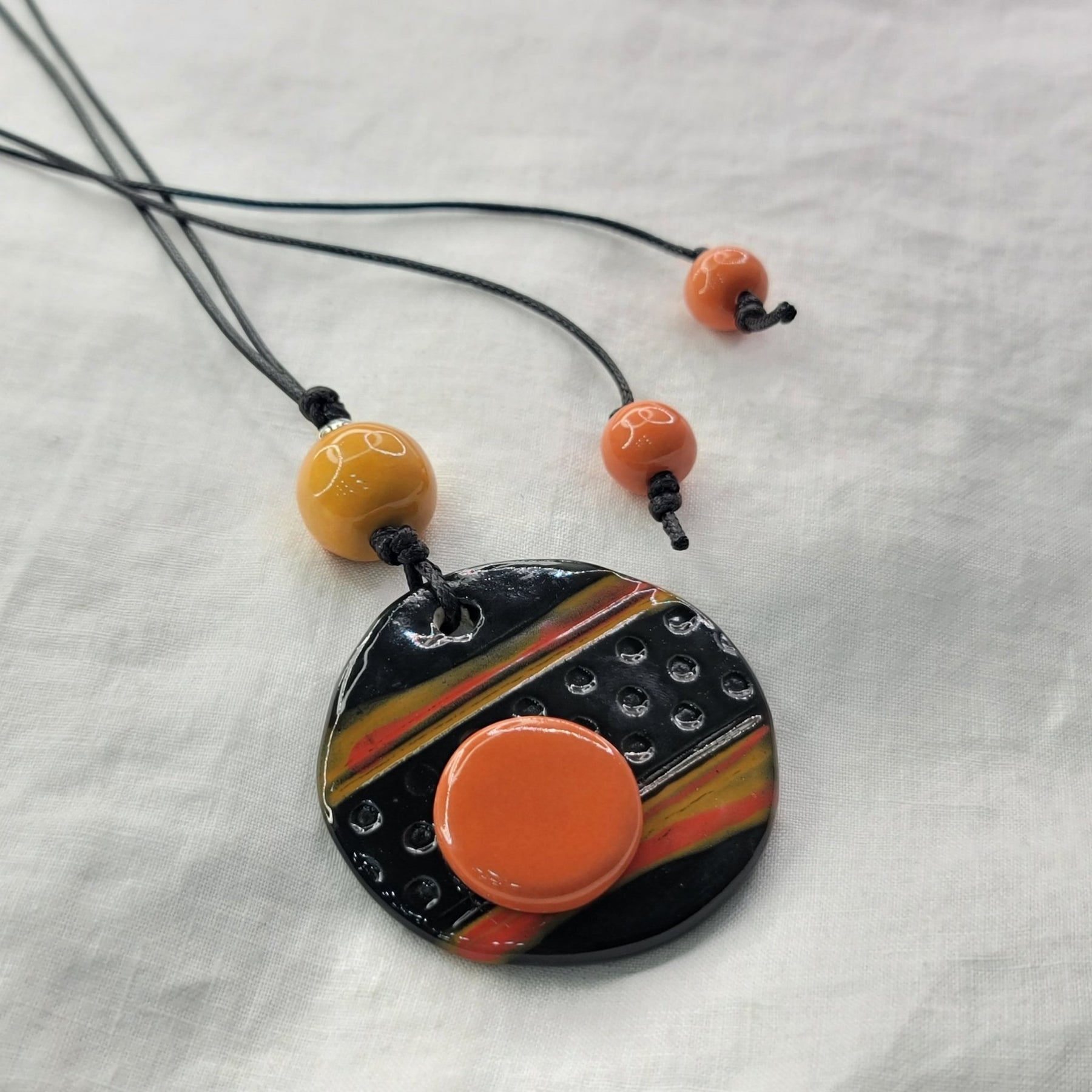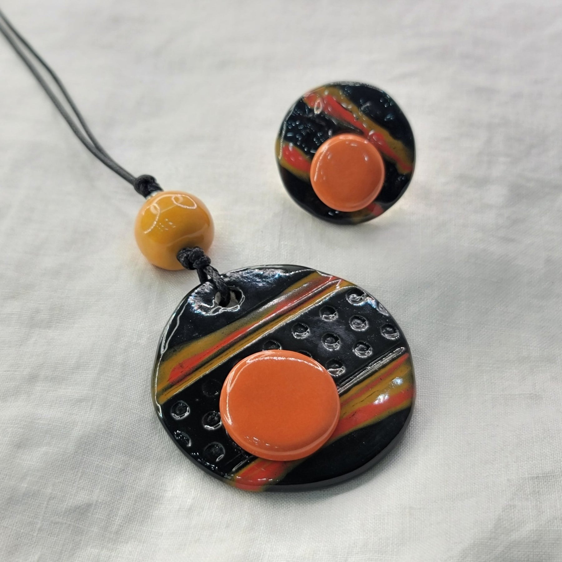 Pieza artesanal hecha a mano en Puerto Rico. Incluye collar y sortija en barro negro con detalles naranja, símbolo de equilibrio y arte contemporáneo.