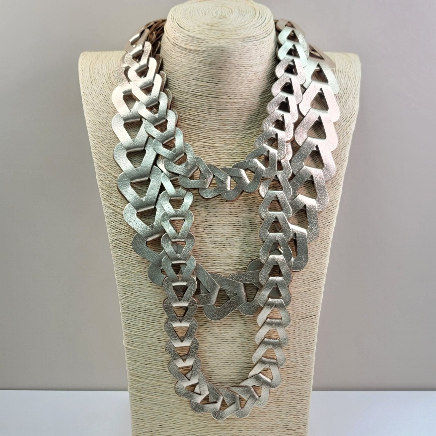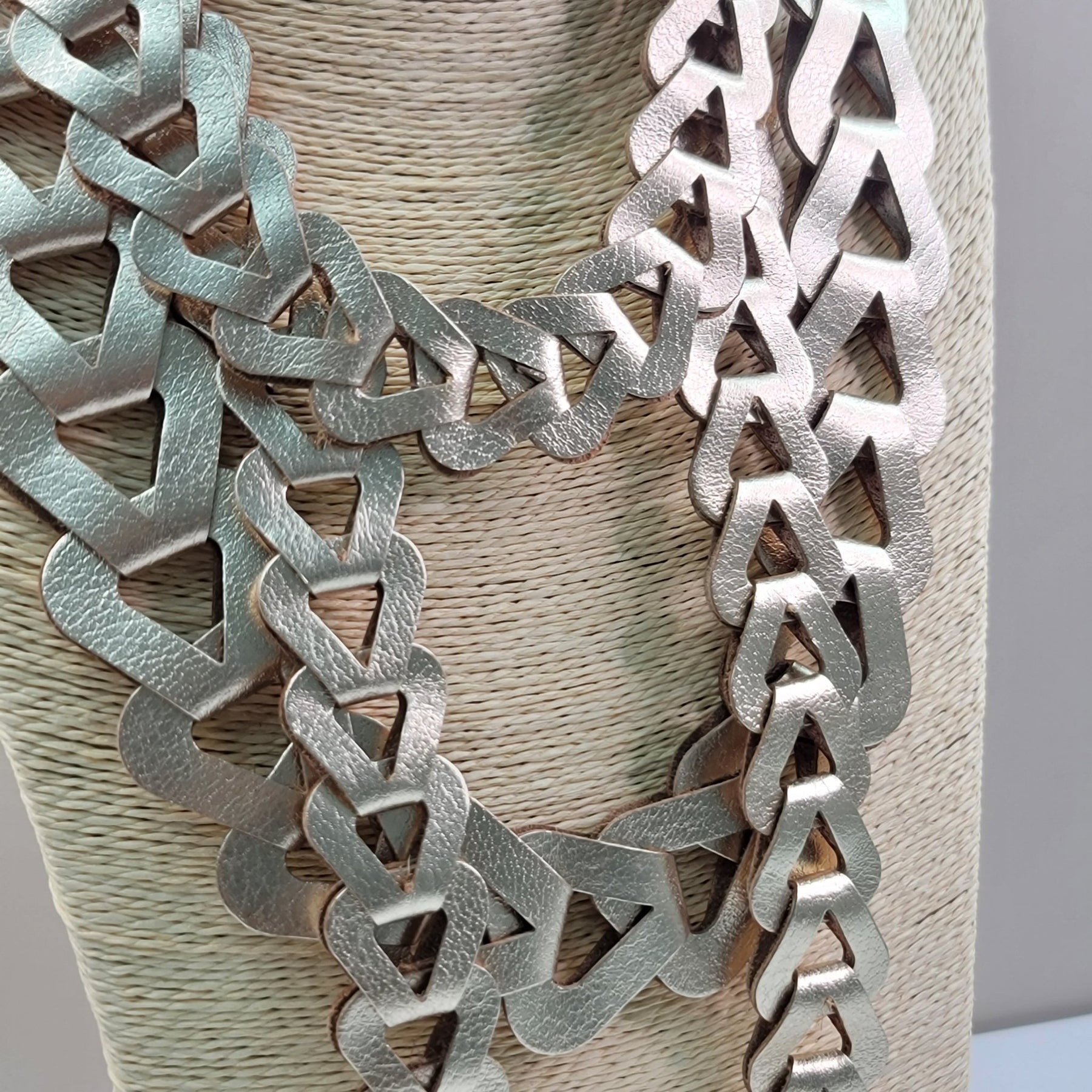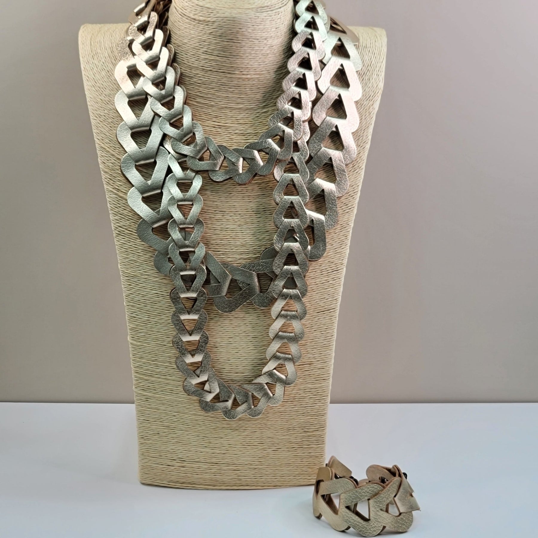 Set artesanal Indumenti, elaborado a mano en cuero y acrílico con acabado metálico.Incluye collar y pulsera — un diseño contemporáneo que combina elegancia y carácter.